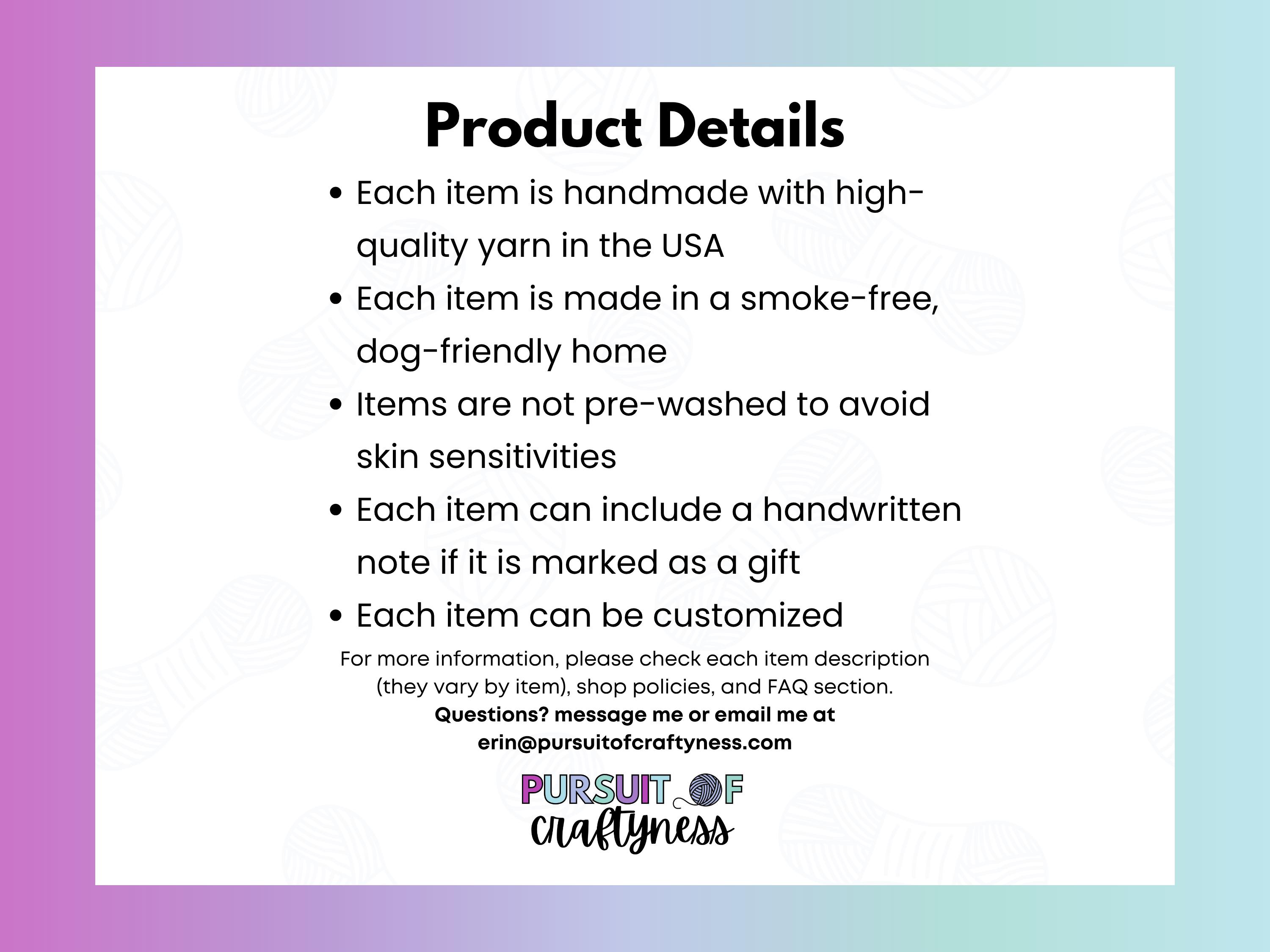 Each product may vary slightly or there may be minor imperfections as items are handmade. Shades of yarn may vary based on yarn availability/ dye lot, but it will always look like the item depicted.